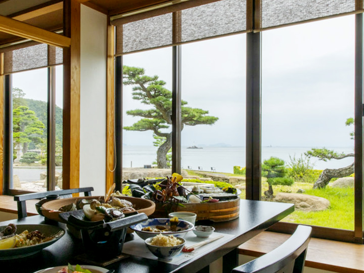 国立公園内に位置し、目の前は海、後ろは山と大自然に囲まれています。お食事は来島海峡で獲れた地魚をふんだんに使った会席を楽しむことができます。海水を沸かした海水露天風呂やダイビング・シーカヤック・SUPなどのアクティビティ、デイキャンプ、会席ランチなどもご利用できます。