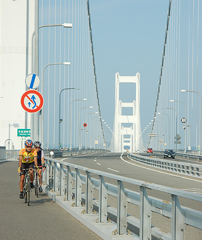 Omishimabashi Bridge is built over the Hanaguri Seto Strait, the dangerous spot with rapid currents. So the view from the bridge looks like it is as if you are gazing out at the river, rather than the ocean.
